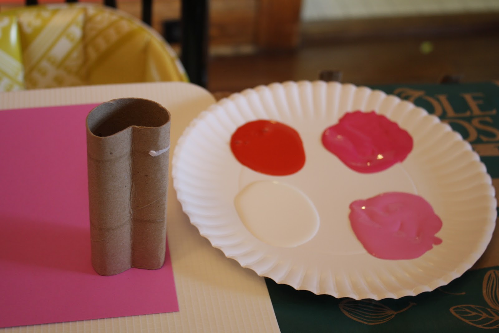 For this project, take a toilet paper roll & pinch the top to make the opening “heart shaped”. Then dip it in paint & use it like a stamp!