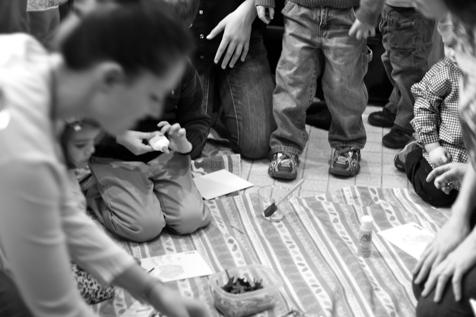 Ahead of time, cut out strips of colored paper & write each child’s name on the cardstock/ canvas. When the kids are ready for the project, paint one of their hands with the yellow paint & paint brush. Make their handprint in the center of the paper/canvas. Let them glue the strips on for a tail & mane. I used little bowls of glue & q-tips for the glueing. Then when the paint dries, draw on the lion face with black marker.