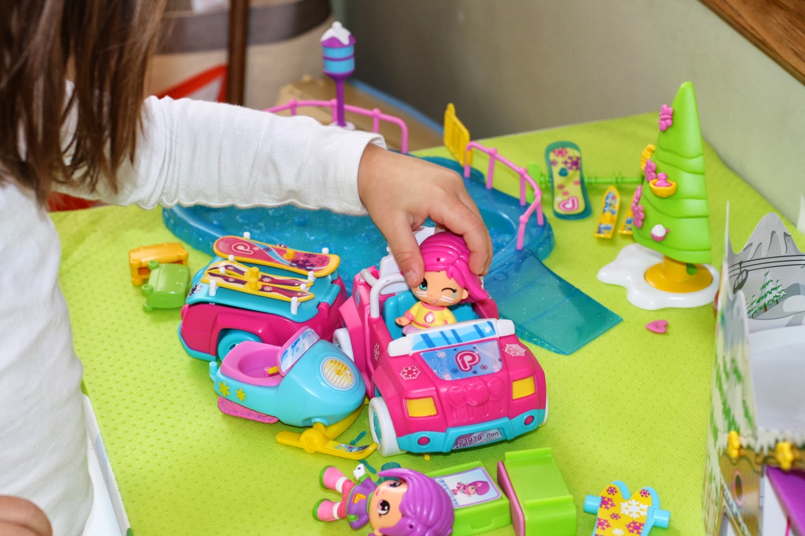 This year I was on the hunt for something new & fun to play with at the holidays. Also, something that was more of a “winter theme” that we could keep out longer. The girls went crazy for the new toy that arrived right around the time we unpacked the Christmas decor:  the Pinypon Snow Ski Lodge playset & the Pinypon Snow Adventure Car & Tow. This set is extra fun for Maggie & Alex because we have been talking a lot about ice skating as a family this winter & teaching Maggie to ski.