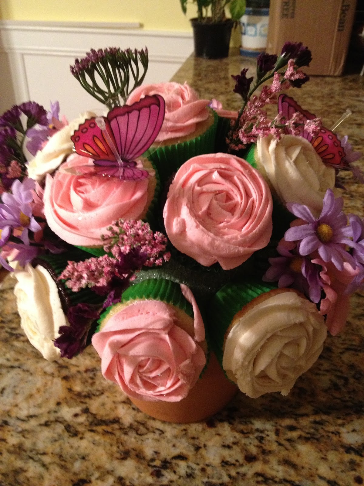 Now, seriously…look below to see this talent.  Karen delivered this beautiful cupcake flower bouquet to our family to welcome sweet baby girl, Abby, home!