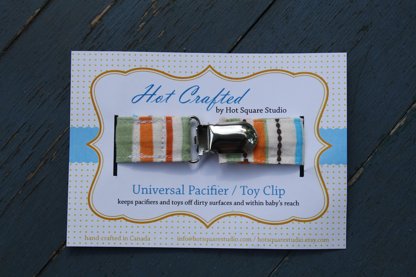 Pacifier clips are a MUST if you have a child who loves his pacifier—we just love the ones from Hot Crafted.  Hot Crafted also features sippy cup leashes, hair bows, and birth announcement prints.  And there’s still time to enter their giveaway—hurry over to our Friday post and enter!
