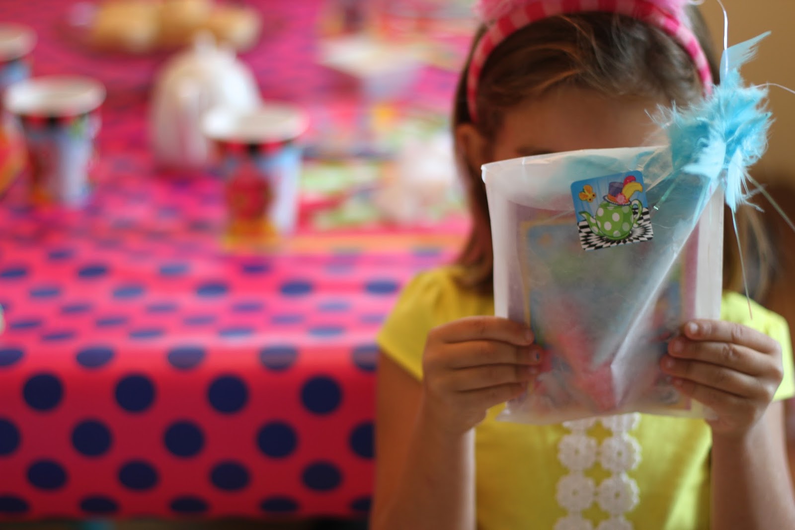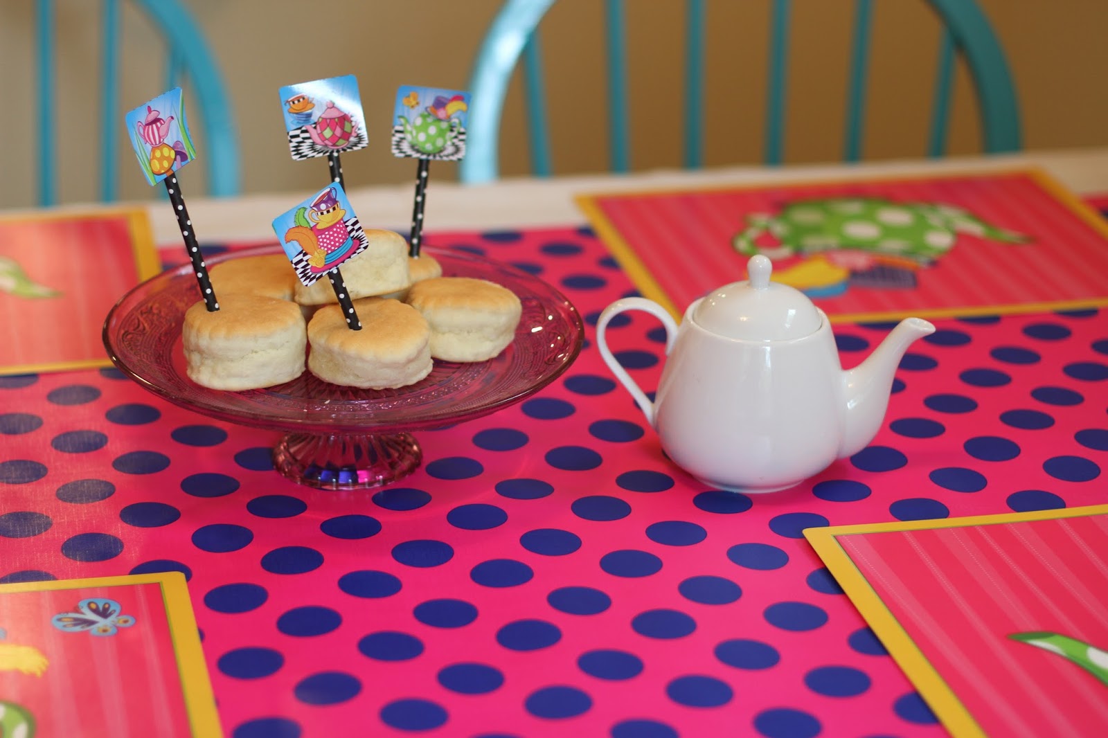 To decorate for the party, we made the main attraction the tea party table. We used all of the Topsy Turvy Tea Party supplies from Birthday Express. The collection was just what we were looking for – a fun, bright and happy tea party! I love all of the bold colors and they went along really well with an Alice in Wonderland theme. For the table, I used a roll of pink and royal blue polka dot wrapping paper over the table cloth to really make it look fun and bright.