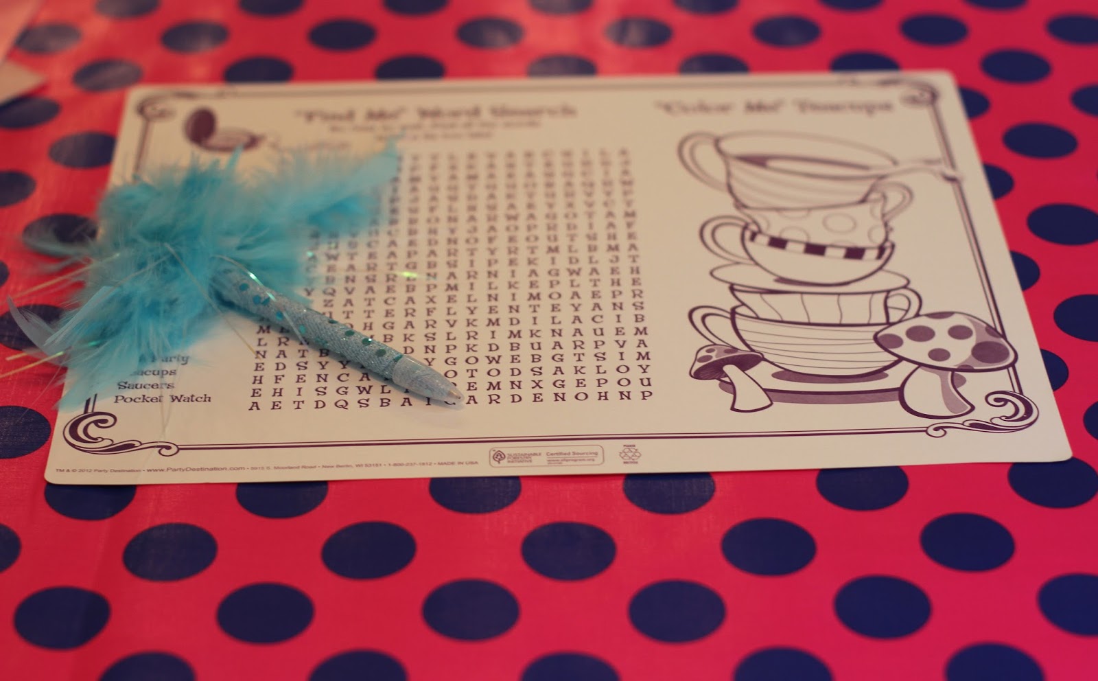 It coordinated well with the Topsy Turvy Tea Party Placemats. I really like that Birthday Express offers placemats that go with the party themes. They make the table look great and the activities on the back help entertain the kids in between planned activities. We gave everyone a fancy feathery pen to do their activities, which made the table look even more fabulous!