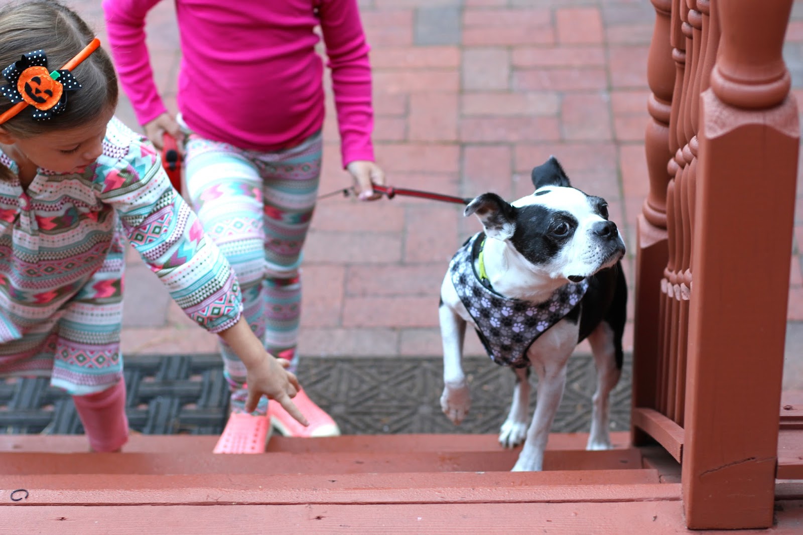 Over the years, you’ve seen snippets of what it’s like to be our Boston Terrier, Jersey. Most of these have been in the form of photos of her being involved in Maggie and Alex’s daily dress up routine. When my husband and I watch Jersey around the kids, we always say “we couldn’t have found a more patient dog”. It’s true. Jersey was our first swing at parenting. When she came along we had no kids and our dog got all our attention all the time. We worried how she would react to us bring a baby into the house, but from day one, Jersey was kind, patient and loving to our babies. She always gets a bit nervous when they learn to crawl and someone new is chasing her around “at her level”, but she quickly adjusts.