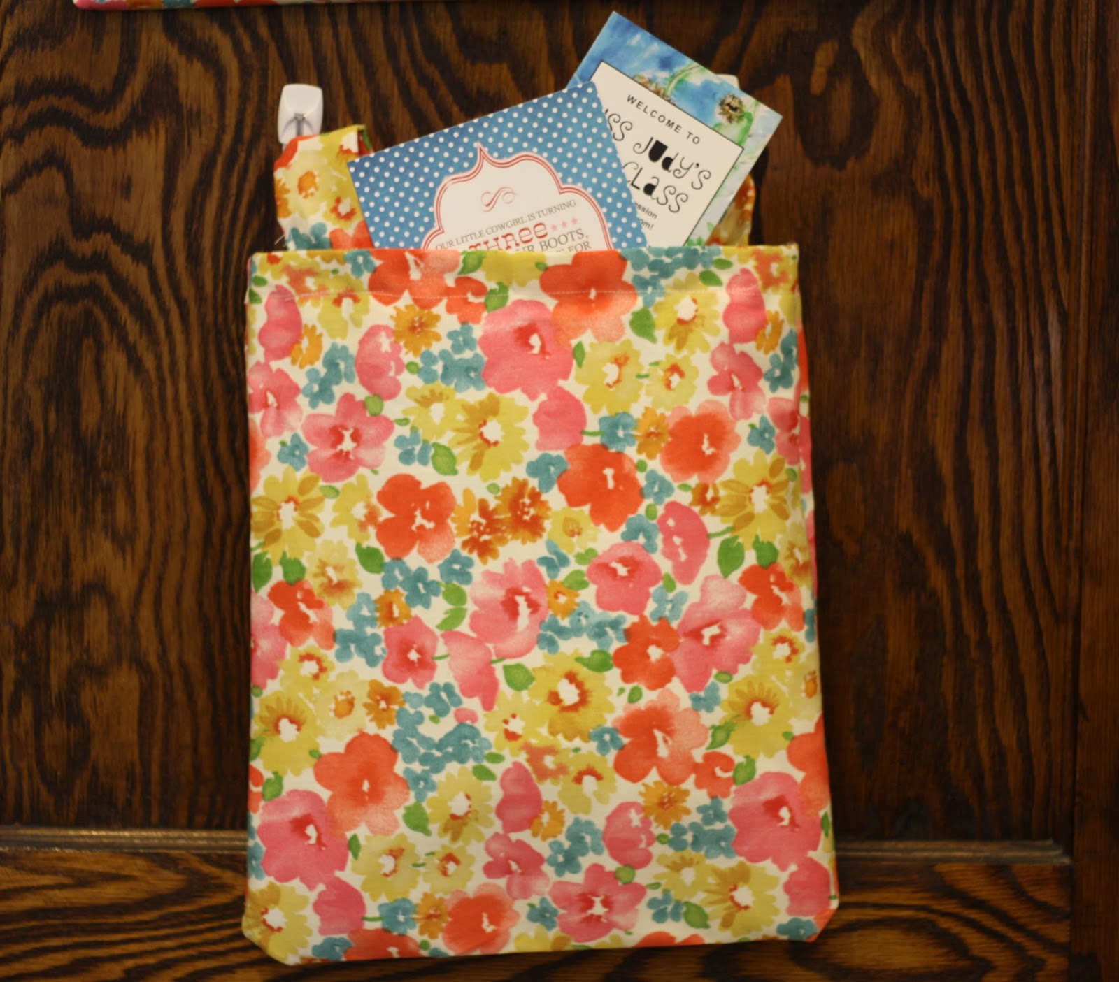 Next, I needed somewhere to put all the papers that get sent home from school. I figured I could also use it to keep birthday invites Maggie gets, ballet school info, etc. I wanted something that would hold a lot, but also be able to hang on the door with the board. I ended up sewing a pouch, the way I would normally sew a bag. I used a similar pattern to make Trick or Treat Bags last year. You can visit this post for more picture details on the pattern.