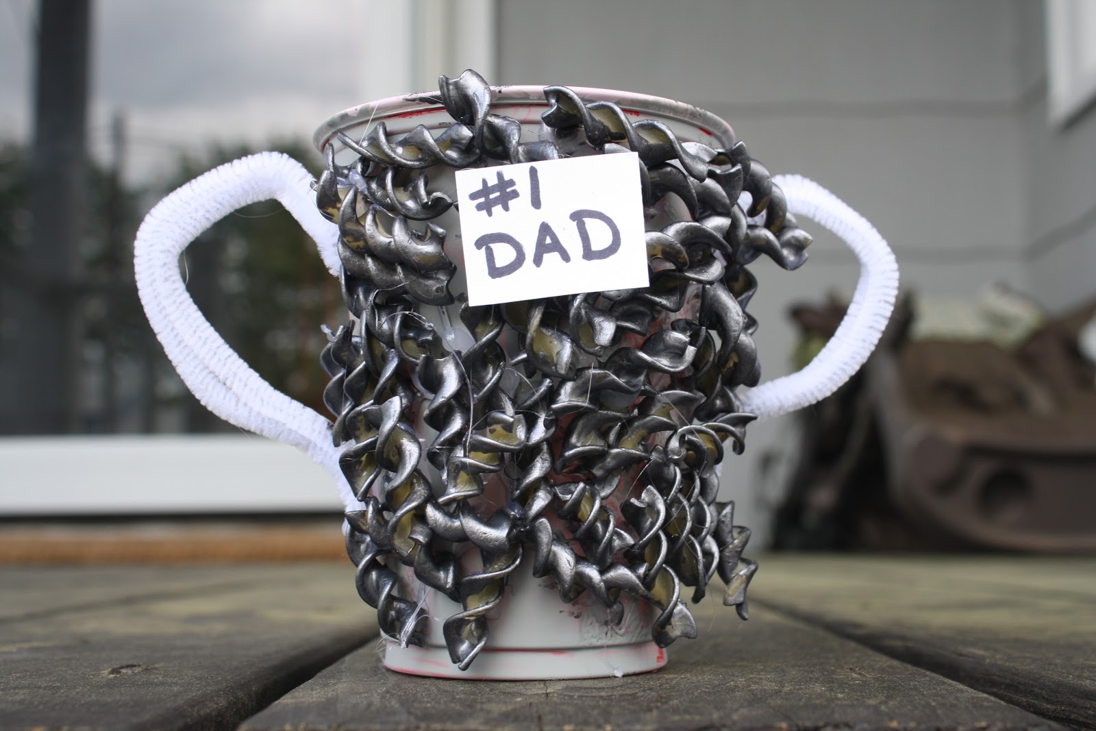 First paint the cup & let it dry. Paint the pasta & let it dry. Bend pipe cleaners to look like handles & glue to cup. Glue the pasta around the cup. Glue on little sign that says “#1 Dad”. Give Dad his trophy!