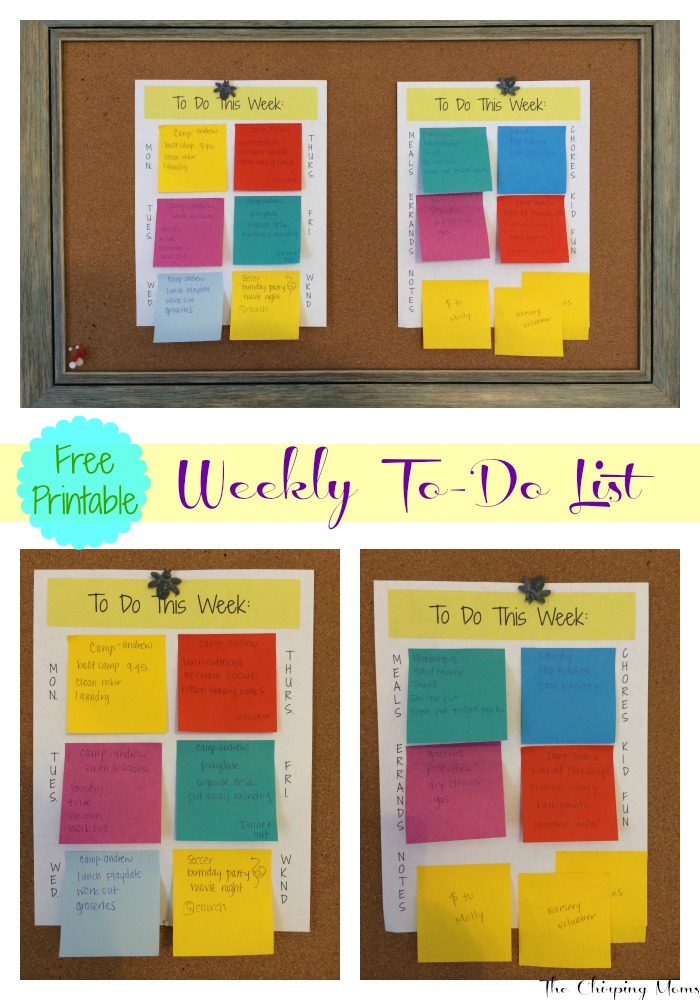To hang, I just printed each page & hung on a memo board in our kitchen for all to see.    Since you are writing on the actual To Do list, thanks to the use of Post-it Notes, you could laminate the To Do list & use it over and over again.  Below I am sharing these free printables for you to print and use.