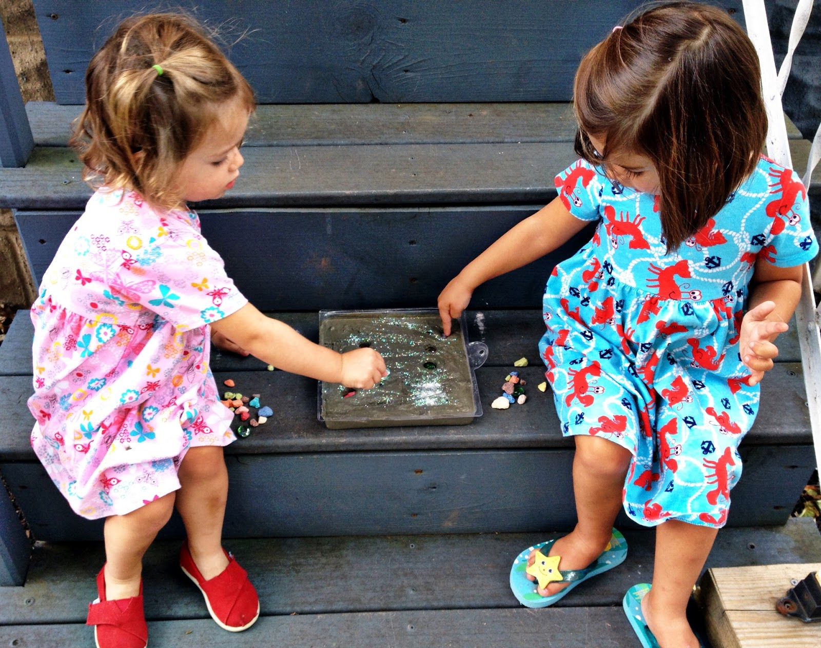Grammy is also a wonderful gardener. I thought a stepping stone made by her granddaughters would be a fun addition to her yard. We got a kit at the craft store. It’s a messy project, but fun. I let the girls “decorate” it all on their own. It came with glitter, stones, etc. You can also do hand prints or foot prints on the stones.
