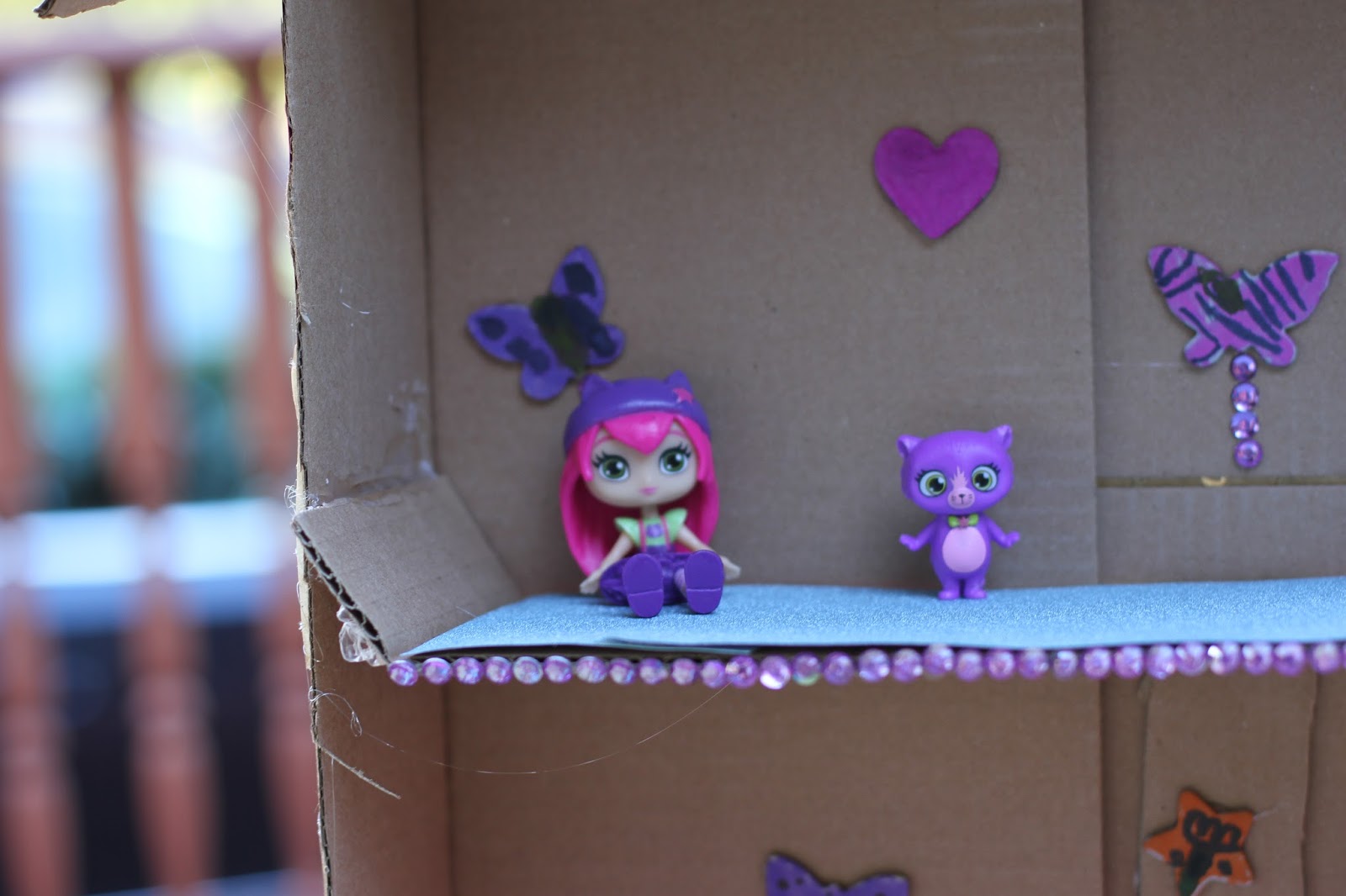 Now it’s the fun part: decorating! Maggie and Alex wanted it to be colorful and “fancy” for the Little Charmers. We had glitter paper that we used as the floors. Then the girls colored in cute little cardboard shapes: hearts, flowers, etc that we glued in the house. We had some rhinestone strips that we stuck on to make the house extra fancy.