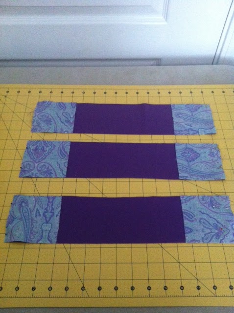 Once you get those sewn, unfold and pin a 15″x3.5″ strip to the on the top of each square, right sides facing each other, left side lined up…sew the edges, so you have one big straight line of pieces sewn together.  You just finished your first section!