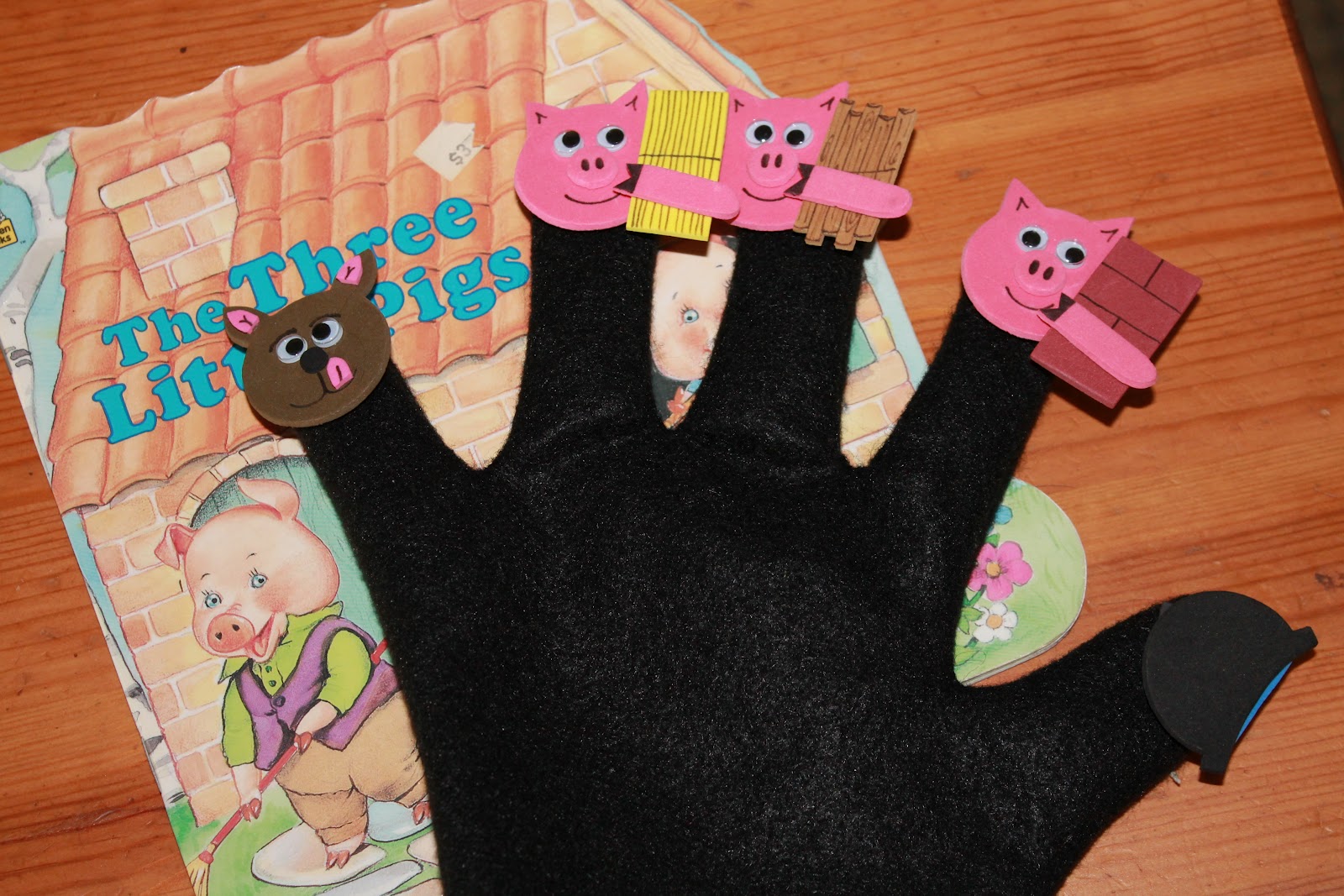 My boys LOVED hearing the Three Little Pigs and helping me put the pig, wolf, and black cauldron onto my fingers as the story went on.   Look at how cute our glove is!  On each of the glove’s fingers is a magnet that attaches to the magnetic story characters.  What a great idea.  Aiden loves to retell the story, especially the part where the wolf huffs and puffs and BLOWS the house down!