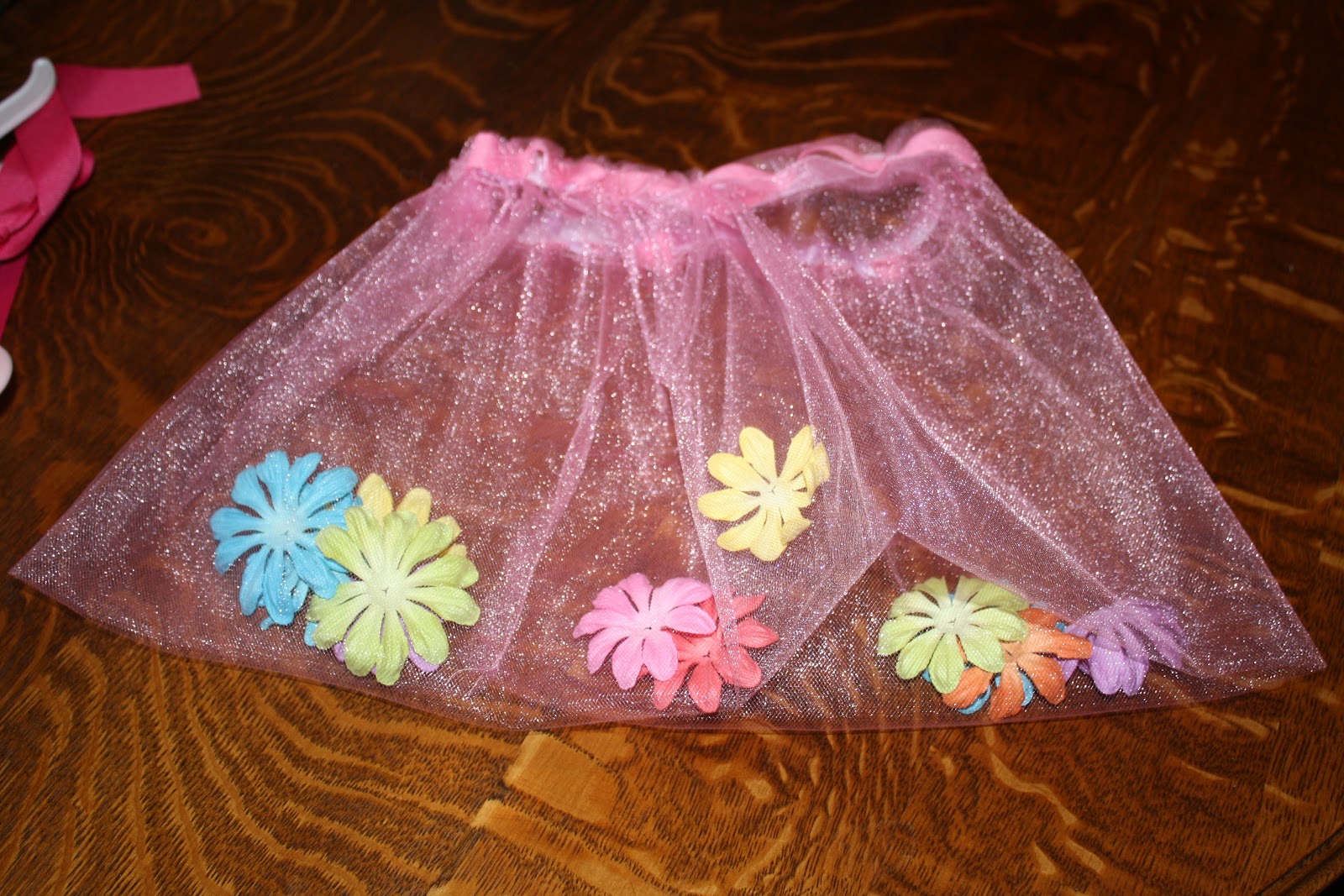 Tulle should be folded in half & then cut to be about 40in wide by 14 in long (this was for about a 2t). Place flowers inside the fold around the skirt. It doesn’t really matter where you place them because they will move around as the kids dance & play.