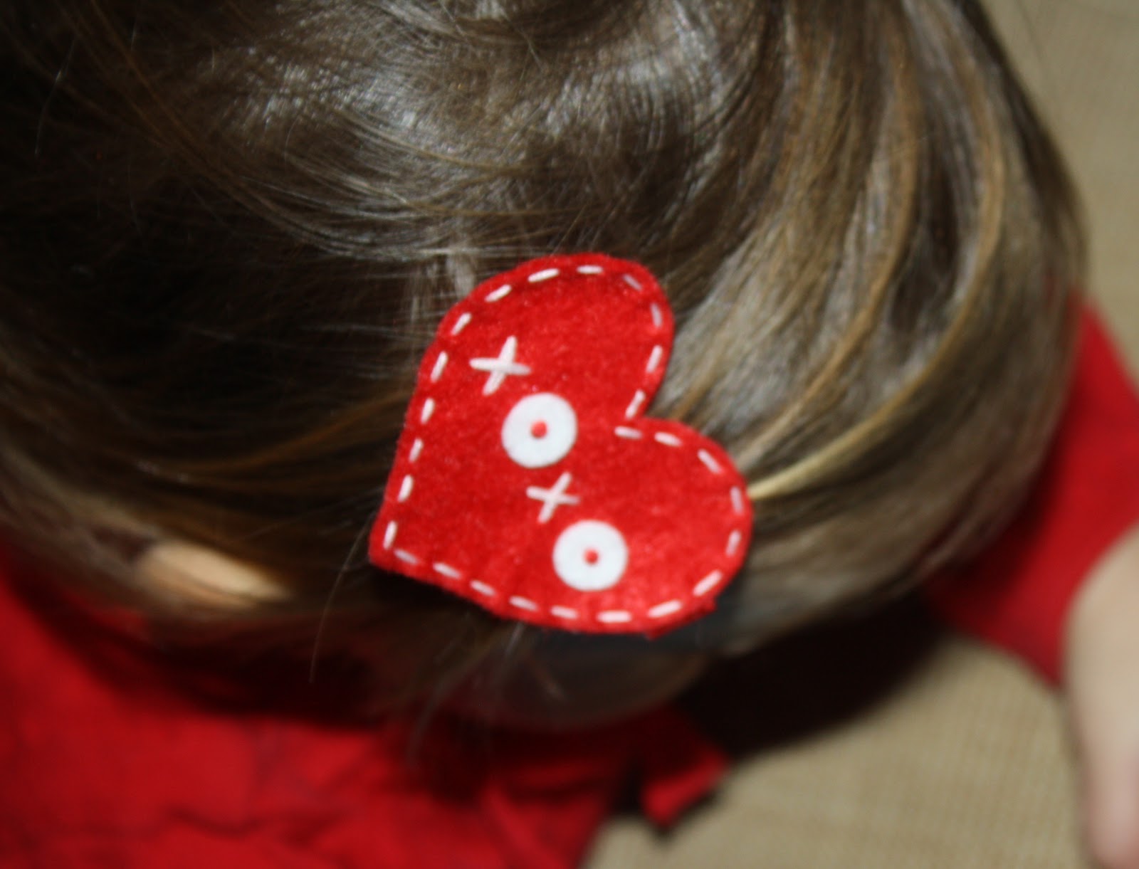 I enjoy making hair clips for the girls. I don’t have much time to do it, so I typically buy them. Around the holidays, I like to try & make them a few. This year I decided to make a bunch & give them to the girls in Maggie’s preschool class as a Valentine (there are only 3 girls besides her, so it’s not too tough!).