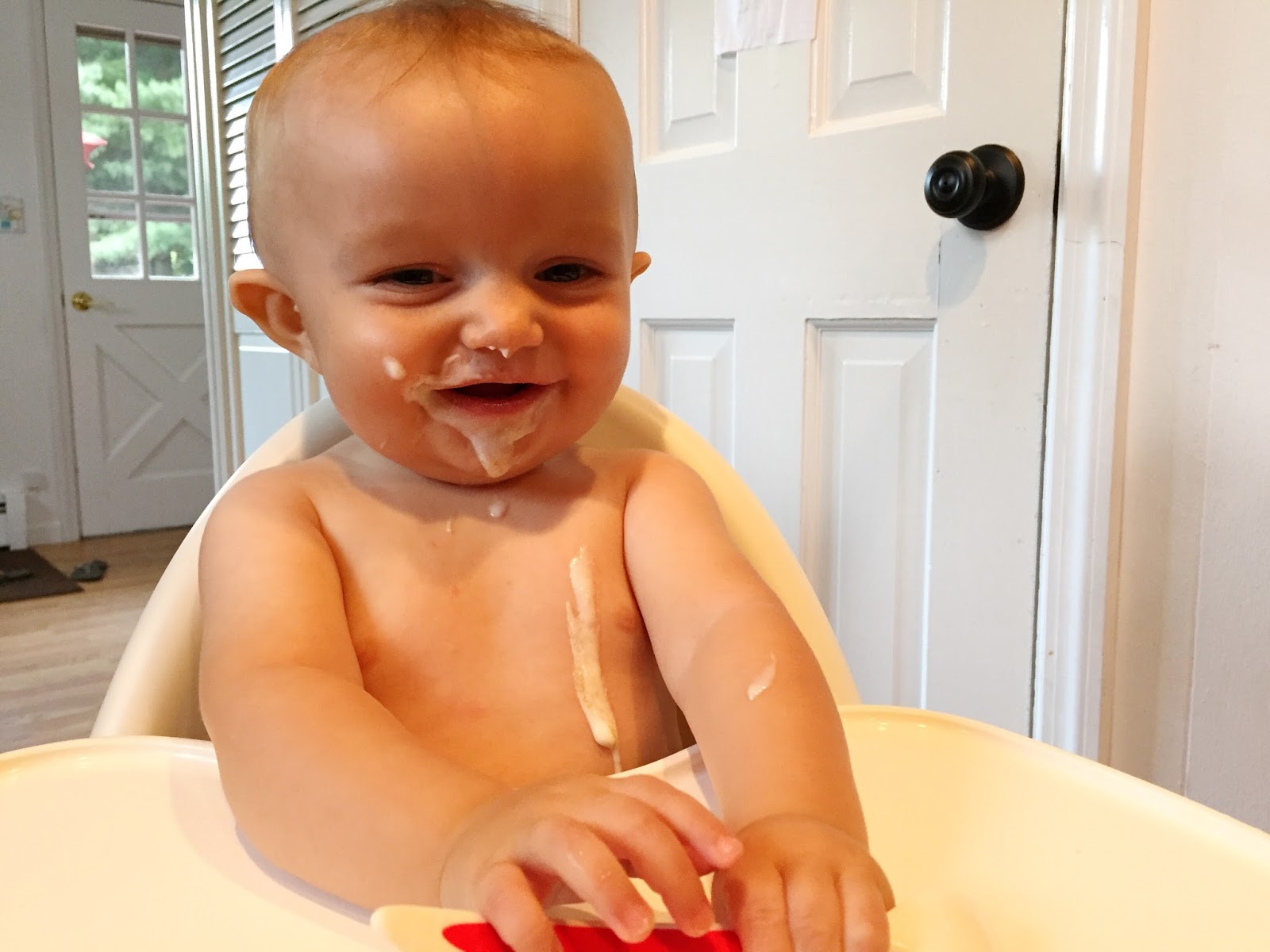 Eating: This has been a big month for trying new foods. Last month Miles had really just started foods and tried rice cereal and fruit. This month Miles has tried: yogurt, sweet potatoes, new combos like “broccoli, peas and pears” and more. He’s also tried couscous, bread crust and grabbed a whole banana. Miles loves Baby MumMums, puffs and Cheerios. He can’t quite pick up the tiny stuff but tries. He prefers foods he can grab and eat and isn’t crazy about baby food. Tommy was like this and we did more of a baby led weaning approach. I have a feeling we’re going in that direction with Miles too. Miles’ favorite thing about mealtime is that he now sits in a high chair at the table with his brother and sisters. He looks from side to side at all of them and smiles so big. He’s so happy to feel like “one of the gang”.