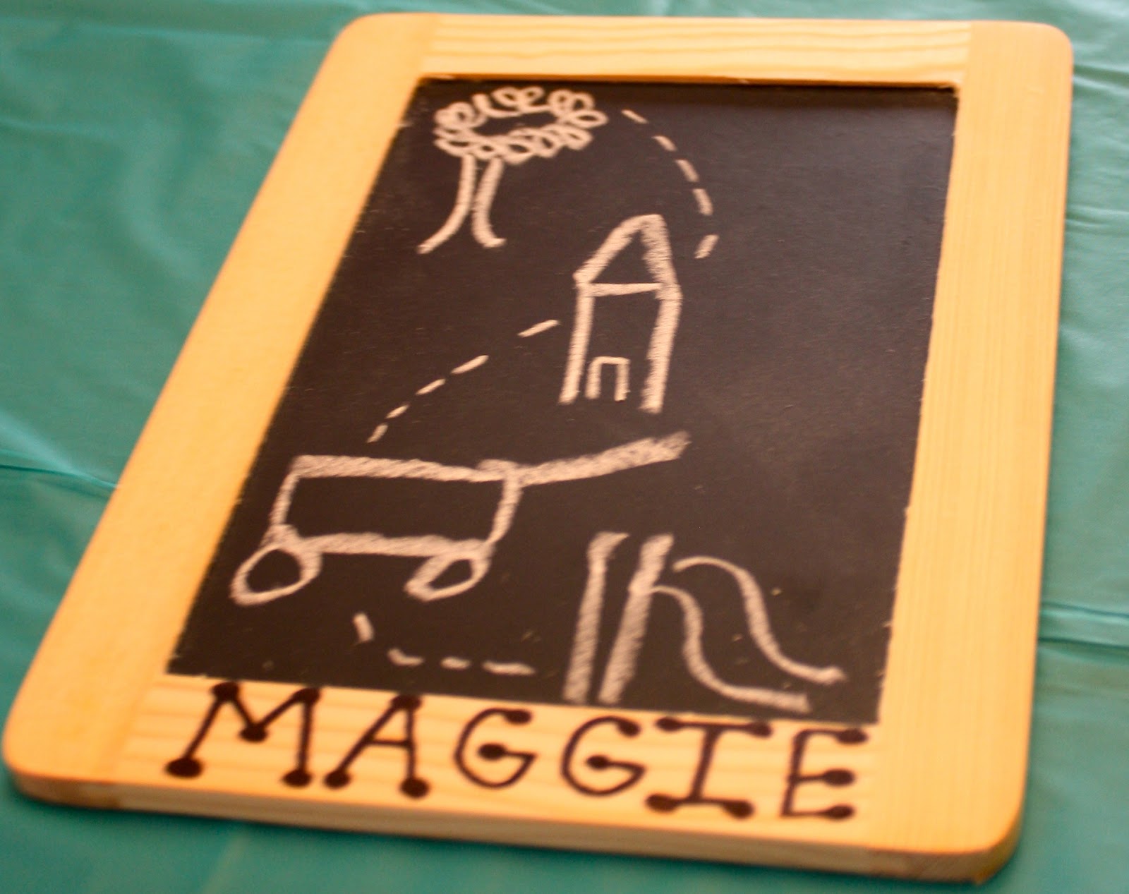 Since we used the Great Slate tintable chalkboard paint in the room, we tied that into our party theme. All of the kids got their own chalkboard with colorful chalk. We used the chalkboards to have a scavenger hunt. Since none of the kids can read yet, we made our scavenger hunt like following a treasure map around the yard.