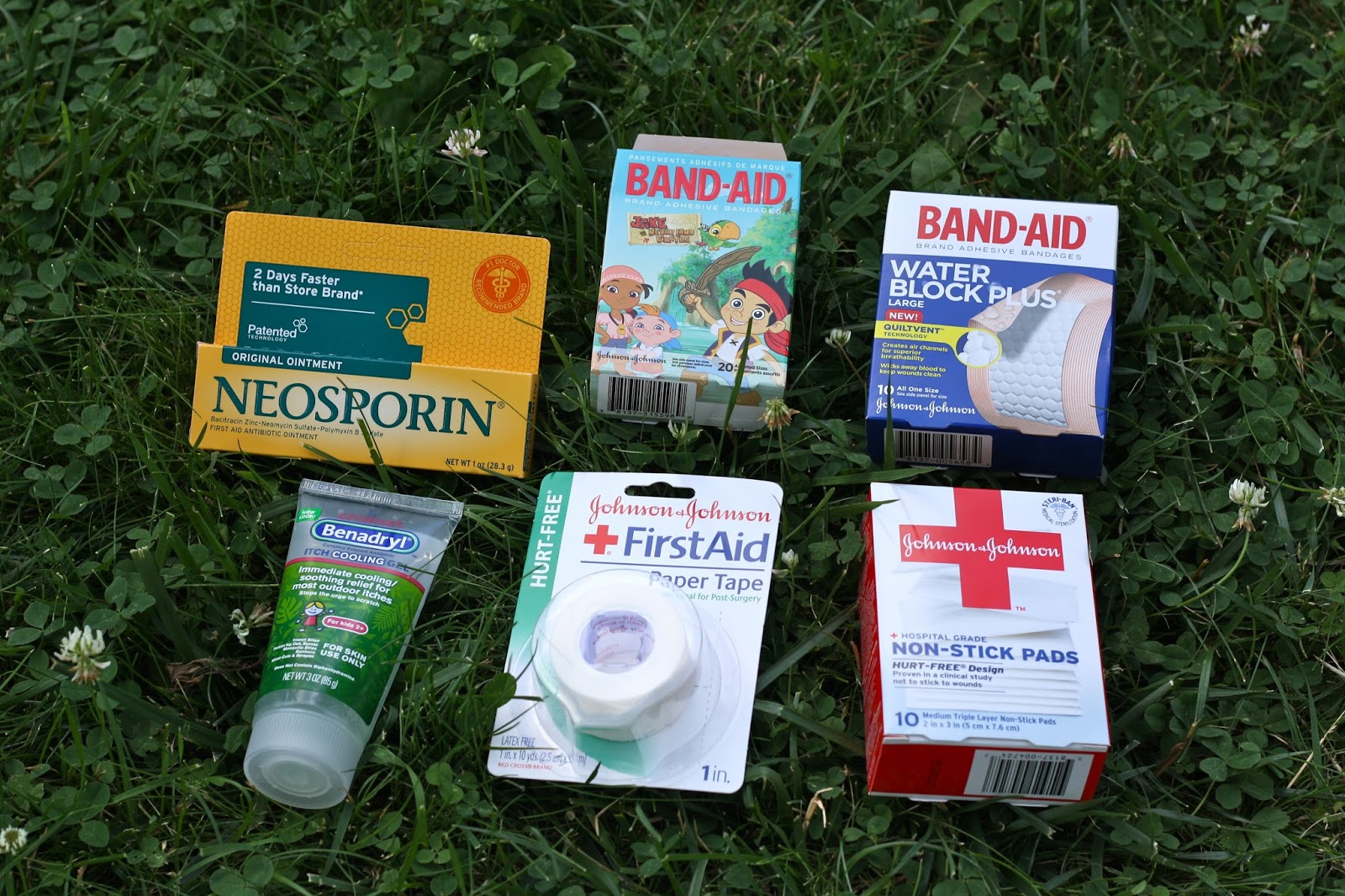 1. Neosporin  2. Band-Aids  3. Water Block Bandages  4. Benadryl Itch Cooling Gel  5. First Aid Paper Tape  6. Non Stick Pads