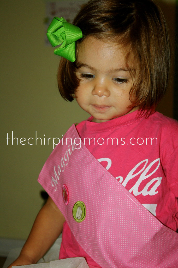 Courtney wants to share a little about her love for Maggie’s new sash:  We had a lot of success using a rewards system with sleeping & staying in her bed when she first moved out of the crib. This is a much better version of the sticker chart – they can wear it! So far, Maggie has a cupcake patch. We have been talking about her sister turning 1 & making her gifts & talking a lot about birthdays. Today, when she finished her card to put on Alex’s gift, I gave her the patch. She has been working very hard on Alex’s gifts! Our next patch will be the for potty training. Here is a picture of Maggie holding the coveted patch! She knows that we will add one on when she starts using the potty & then another one when she starts using the potty at school.