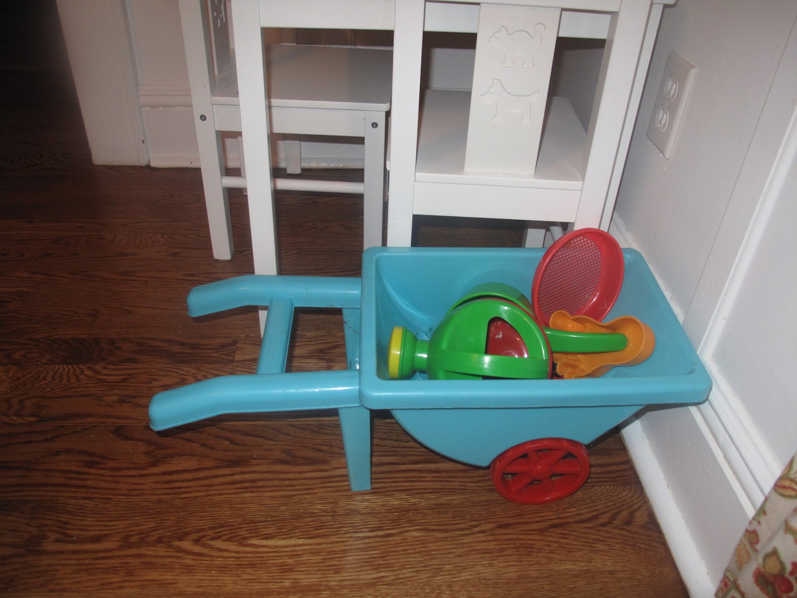 A sand wagon full of sand toys and…this massive pile of stuff–bike helmet, Hot Wheels and helicopters, three DVD’s, three board games, a Mickey Mouse puzzle, baseball glove, and several books.  Missing—the Hess fire truck that my boys keep fighting over:)