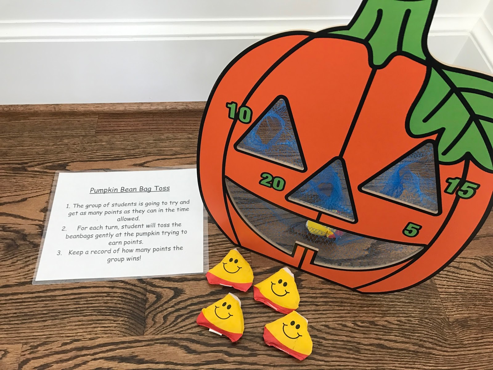 For this game, the kids try to throw the candy corn bean bags into the pumpkins.  As a small group, within the time alloted, the kids will work together to get as many points as they can.  Pumpkin Bean Bag Toss is a game that you could reuse year after year, if needed!