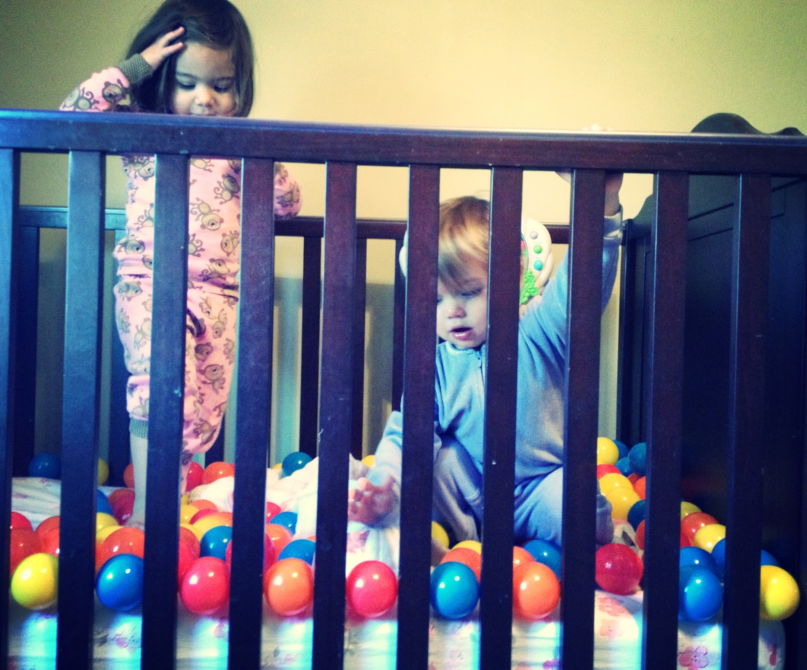 Fill the crib with the kids & the bag of balls & let them jump & play. My kids love this. They played for a while & then here’s a toddler activity for clean up: practice numbers & colors. I would ask Maggie to find “2 red balls” & she would find them & push them through the railings to me. With 120 balls, this lasted a while!