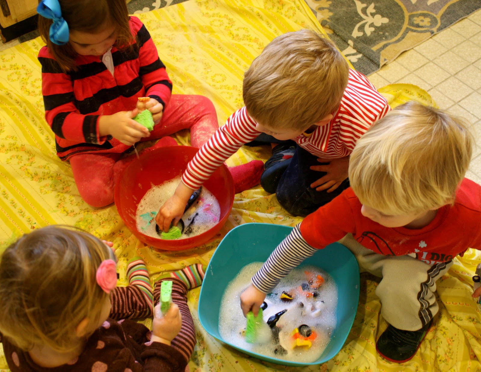 Many of you have probably seen a similar recipe for Cloud Dough. We call ours indoor sand & have a little beach party when it’s 20 degrees outside. Usually after all the toys are covered in flour/oil, we switch to cleaning them in their “pools” of soapy water.