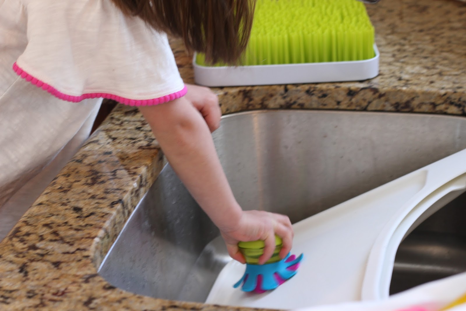 Another fun cleaning product is the new FORB Mini. It’s a soap dispensing silicone dish brush. Not only is it easy and effective for cleaning, but it’s so bright and fun that my girls ASK to clean with it. Here’s Alex scrubbing Tommy’s nasty high chair tray clean.