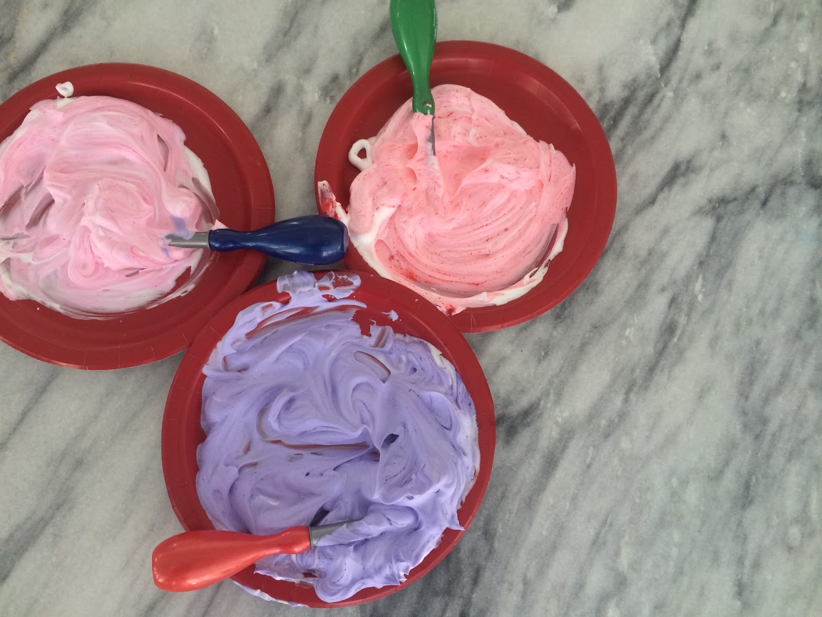 Directions:  For this craft, I just mixed some regular shaving cream with food coloring.  The kids had a blast painting with red, pink, & purple shaving cream!
