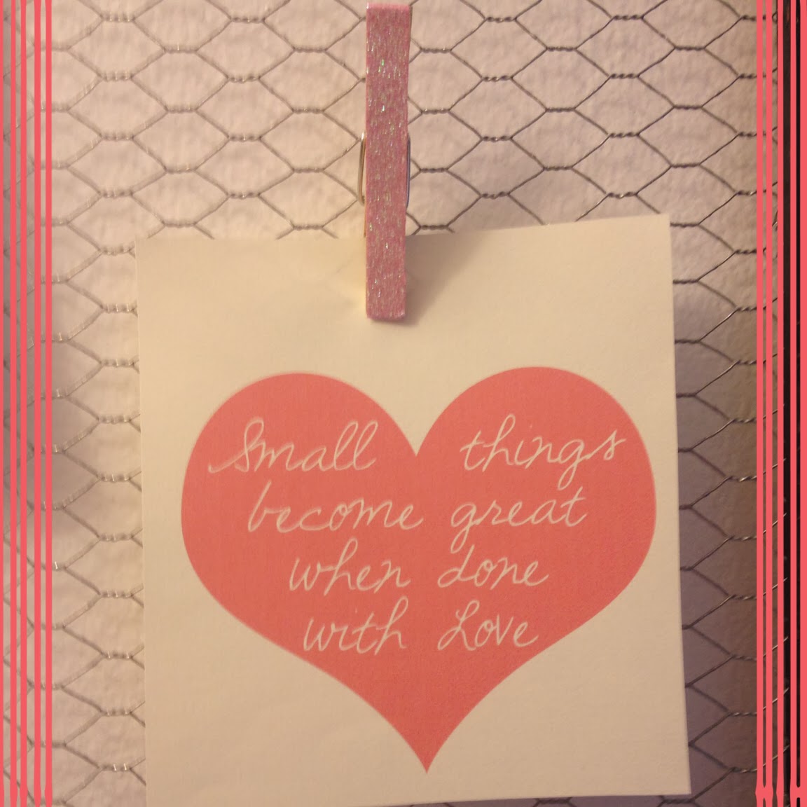 Directions:  Clothespin the Valentine printables to the memo board.  To make the clothespins more festive, I found this awesome glitter tape at Michael’s that I just taped right to the front of the clothespins!