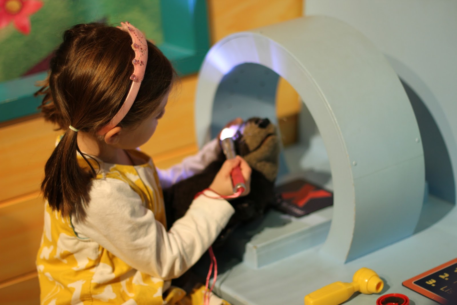 Like I mentioned, my girls play “animal rescue center” all the time at home. So when they saw a REAL Dora & Diego Animal Rescue Center that they could play in, they were jumping for joy. It was hard to get them to leave. There are chips in the stuffed animals that make the scanner respond to which stuffed animal is placed in it (just like the show) and supplies to help the animals in danger. There is also an adorable “animal wash” station.