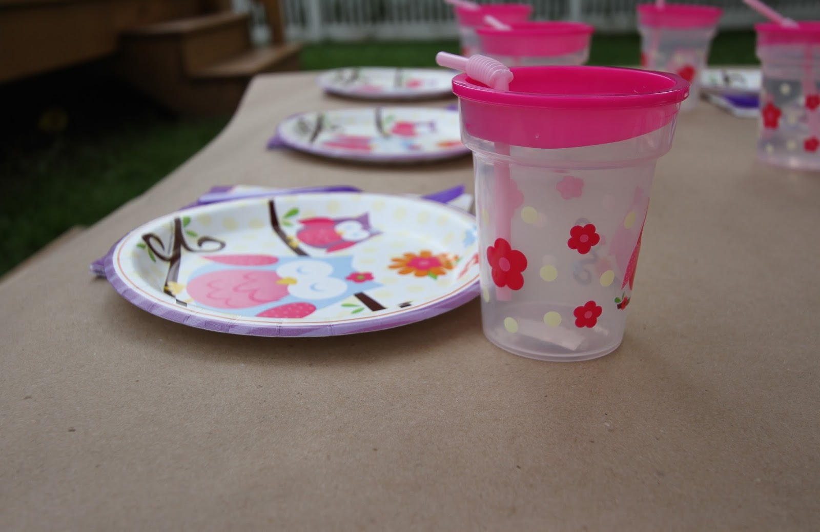 For the plates, napkins, flatware and cups, we used the Owl Blossom party supplies from Birthday Express. The reusable owl cups looked so cute on the table and were a nice treat for the kids to take home.